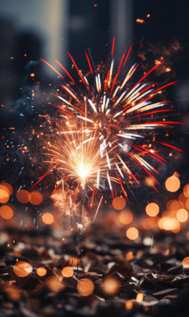 A firework display with lots of sparks and a blurry background. Concept of excitement and energy, as the fireworks light up the sky and create a dazzling display of colors and patterns