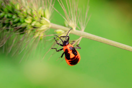 Spilostethus pandurus seed bugs insect of medium size and striking colors red and black perched on twig on unfocused green background light by flash