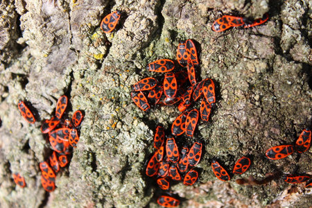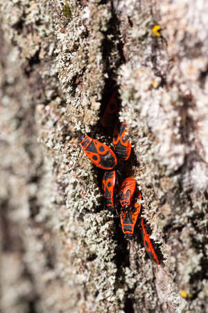 Colony of Pyrrhocoris apterus beetles in the wild on a tree trunk