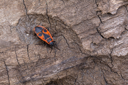 Insect (firebug, Pyrrhocoris apterus) on lime bark.