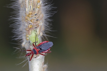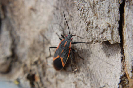 hiding in the bark of a tree insects black and red. Shallow depth of field on the picture, focus on beetles