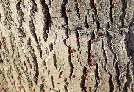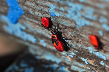 Red bugs bask in the sun on tree bark. Autumn warm-soldiers for beetles.