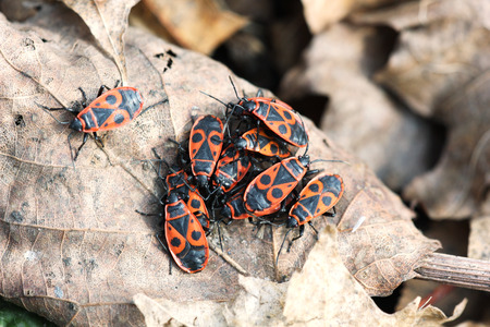 The firebug, Pyrrhocoris apterus, insect on the dry autumn leaf, some beetles in focus, some are not