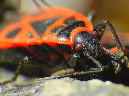 Beetle soldier or firebug in macro with blurred background. Eyes, head in focus and body in red and black colors with dots. Photo of macro world.