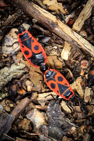 The firebug, Pyrrhocoris apterus, a common insect of the family Pyrrhocoridae, easily recognizable due to its red and black coloration