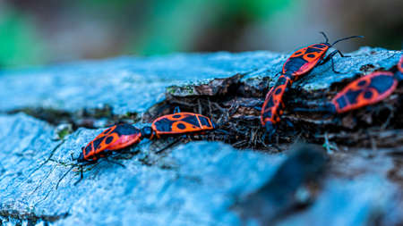 Close-up view of many firebugs Pyrrhocoris apterus on tree stub. Details of beautiful red beetles colony.
