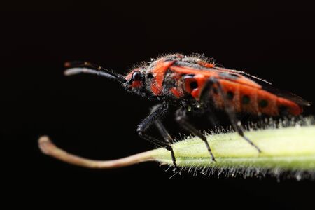 Beautiful orange-black bug with white dots sits on the ginger decorative spikelets on blurred floral background. Latin name - Corizus hyoscyami
