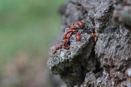 firebug. A lot of red beetle insects on the bark of a tree in the garden. selective focus. Pyrrhocoris apterus.