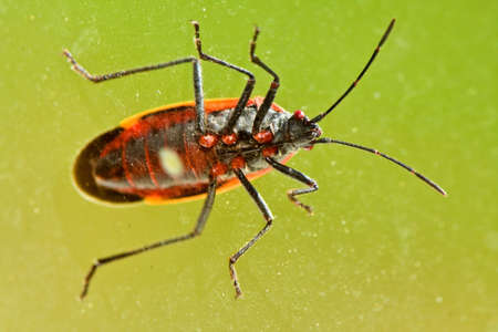 Closeup on a small Mirid bug, Deraeocoris ruber , hanging on a green leaf in the garden