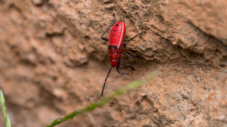 Beetle soldier or firebug on the ground goes to his goal. Red firebug closeup. Postcard with copyspace