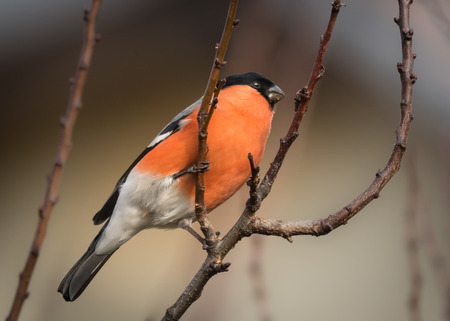 Bullfinch sitting on a branch without leaves in the autumn or winter. The Eurasian or common bullfinch, pyrrhula pyrrhula