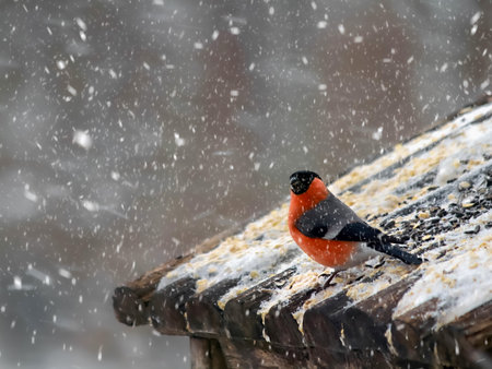 Bullfinch in winter sits on a wooden feeder