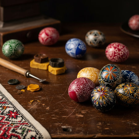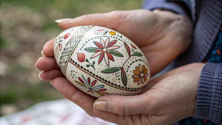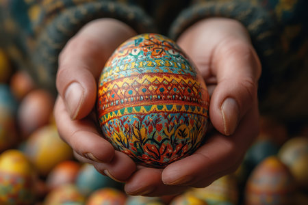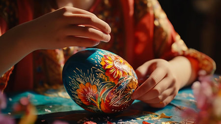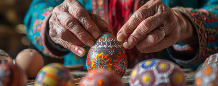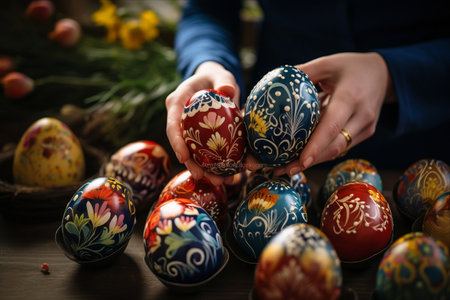 Close-up of hands decorating intricately patterned Easter eggs. A celebration of tradition and artistry.