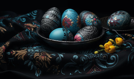 Pysanky in a bowl, Ukrainian Easter eggs decorated with wax-resist dyeing technique, dry flowers, black wooden background