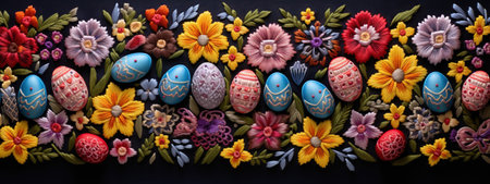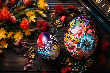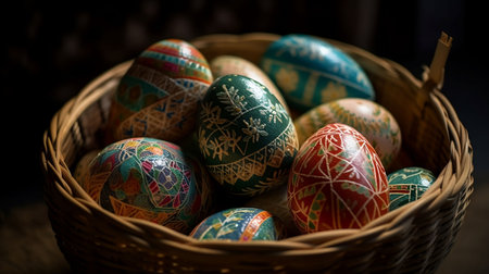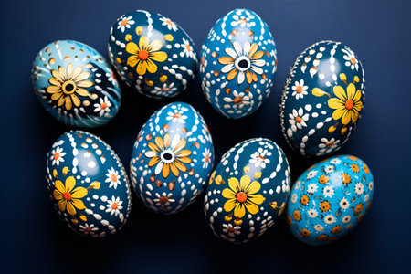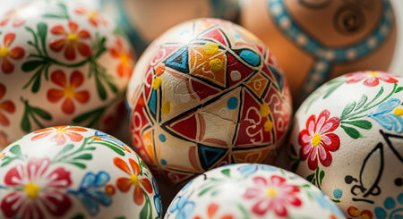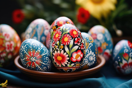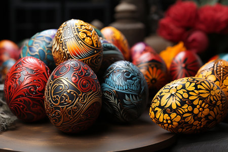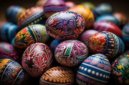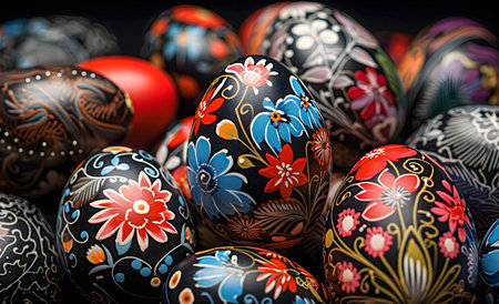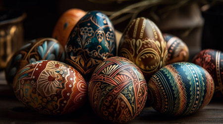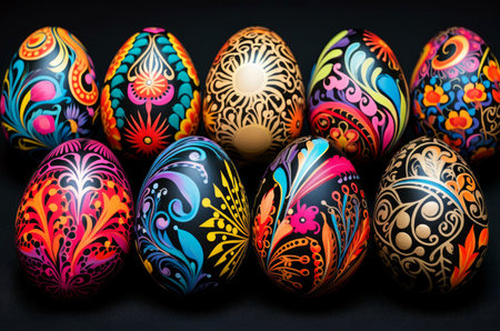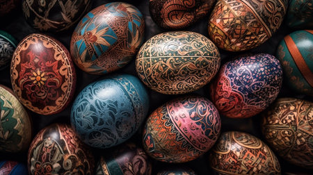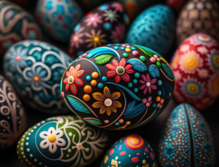 Hand painted easter eggs displaying vibrant floral and geometric patterns, celebrating the festive spring season. Ai generated image