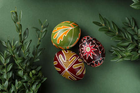 Pysanky, Ukrainian Easter eggs decorated with wax-resist dyeing technique, buxus tree brunch on green background