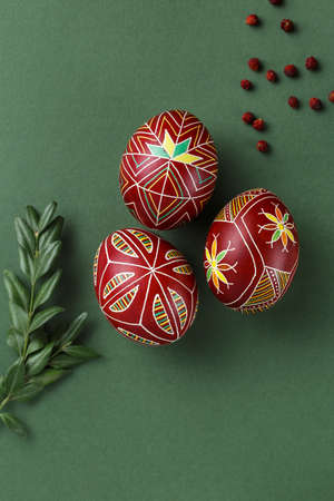 Pysanky, Ukrainian Easter eggs decorated with wax-resist dyeing technique, buxus tree brunch and drye berries on green background