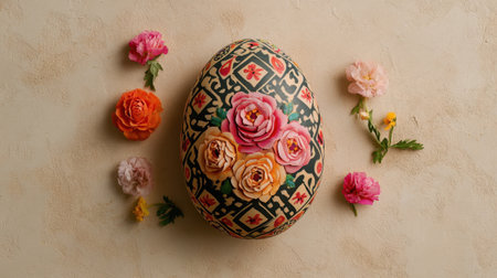 A beautifully decorated egg with intricate patterns is surrounded by fresh, colorful flowers. This artistic arrangement evokes feelings of springtime and celebration.