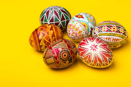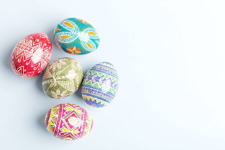 Ukrainian Easter eggs decorated with wax-resist dyeing technique, traditional for Eastern European countries, wide format, top view, copy space
