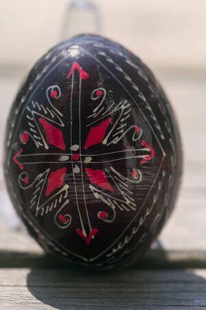 Ukrainian woman hand painted Easter egg. Geometric slavic decoration ornaments