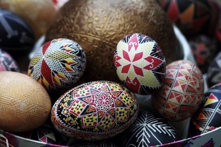 Grouped pysanky eggs with traditional design on them.