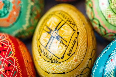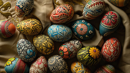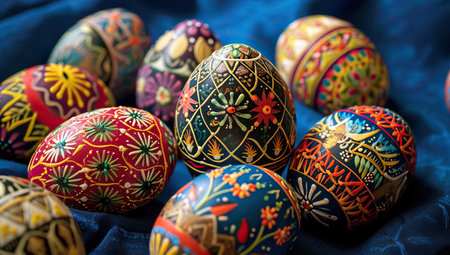 Detailed display of hand painted ornamental folk art eggs traditional ukrainian pysanky patterns in vibrant colors array