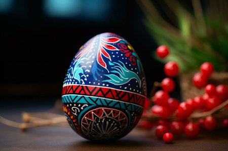 A beautifully painted Easter egg in vibrant colors sits among red berries, creating a festive and celebratory image.