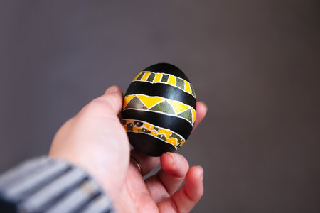 Defocus Easter black and yellow egg in female hand. Close up Easter eggs pastel colored on gray background. Minimal Easter celebration concept, dyed chicken egg. Out of focus.