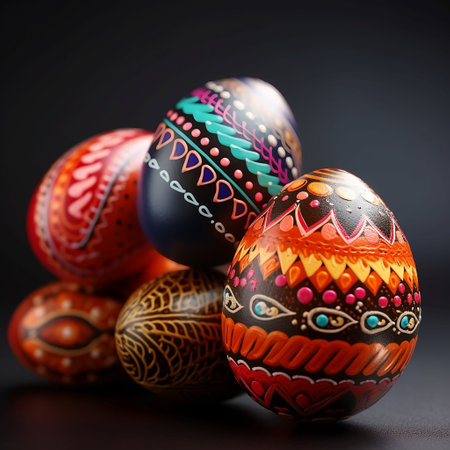 Easter eggs close-up on a dark background with floral patterns.