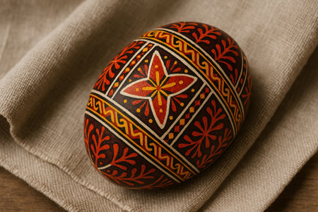 Intricately decorated orthodox easter egg with traditional ornamental patterns and vibrant colors on linen cloth background.