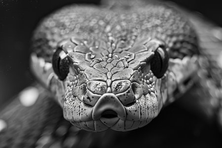 The tension is palpable in this monochrome image of a coiled python, its scales detailed and eyes alert, conveying poised readiness.