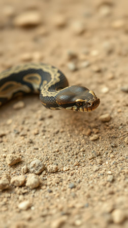 Close-up view of a python resting on the ground in a natural habitat during daylight hours