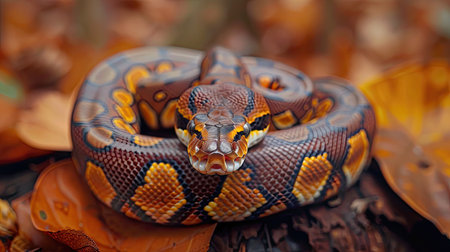 Colorful python snake resting in its natural habitat during daylight hours in a lush environment