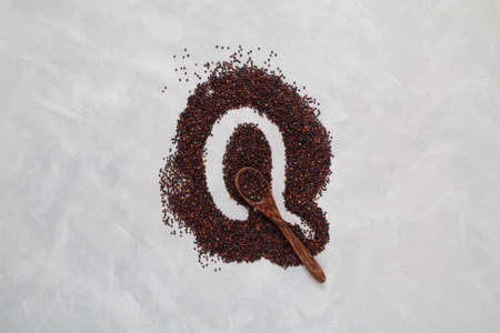 Black quinoa seeds scattered on table in form of letter Q. Wooden spoon with groats, top view. Healthy cereals contain a large amount of protein, antioxidants, dietary fiber, vitamins and minerals.