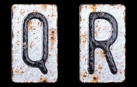 3D render set of capital letters Q, R made of forged metal on the background fragment of a metal surface with cracked rust. 3d rendering