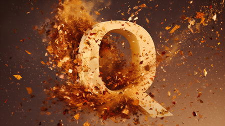 Shattering letter Q 3D realistic raster illustration. Twisted letter with explosion effect on dark background. Isolated design element. Golden and white font. Destroying alphabet symbol fragments