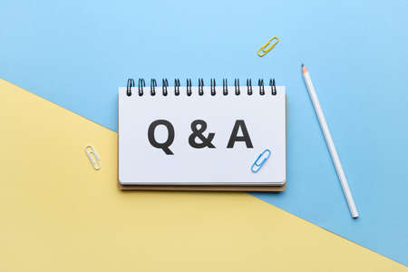 Q and A word acronym on notebook planner on white table, questions and answers concept, flat lay