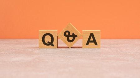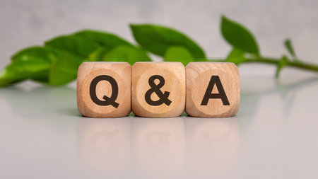 Wooden blocks spelling Q and A on a glossy reflective surface with a green plant in the background. Suitable for question and answer, support, FAQ, community topics.