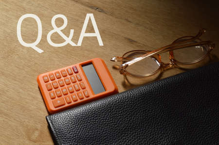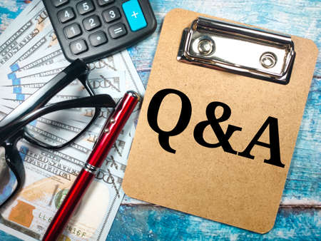 Business concept.Text Q AND A with pen,banknote,calculator and glasses on wooden background.
