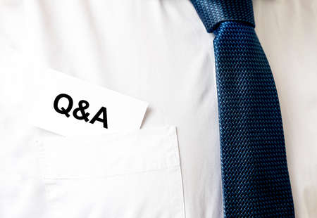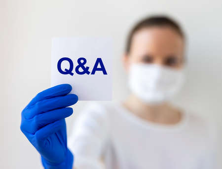 Q and A text word inscription acronym on paperin hands of doctor. medical questions and answers concept, gloves