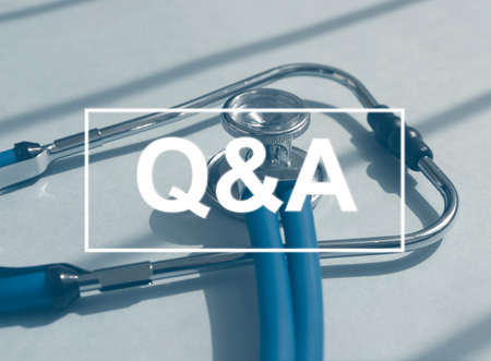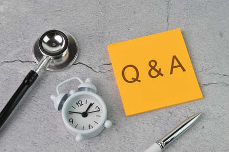 Top view of clock, stethoscope and memo note written with Q&A