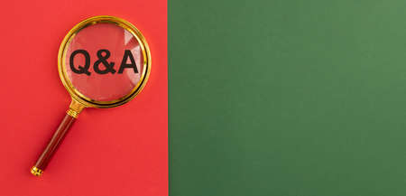 Qna inscription on red and green banner through magnifying glass. QA acronym. Q concept. Questions and answers. Background with copy space.