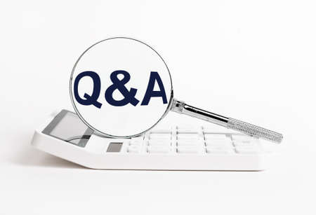 Calculator and magnifying glass with qa abbreviation. Search for answers to questions in business, statistics, finance field. High quality photo