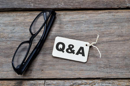 Top view of eyeglasses and wooden tag written with text Q and A