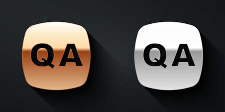 Gold and silver Speech bubbles with Question and Answer icon isolated on black background. Q and A symbol. FAQ sign. Chat speech bubble and chart. Long shadow style. Vector