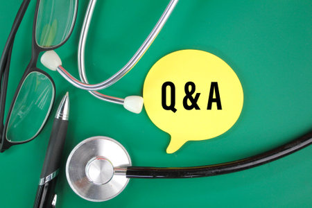 stethoscope, pen, glasses and paper with letters Q and A. Q and A health concept. Healthcare and medical questions and answers