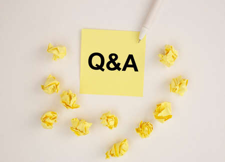 Q and A text word inscription acronym on paper card on office table, questions and answers concept