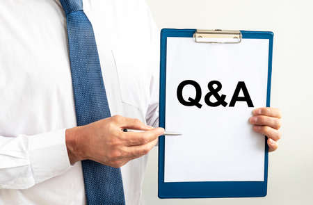 Q and A - Questions and Answers - sign on paper shown by a businessman, white background