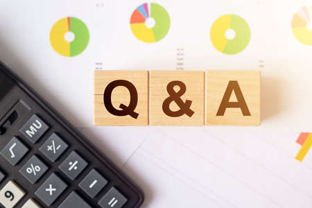 Q and A acronym letter word on wood blocks on office table with financial accounting documents with charts diagrams