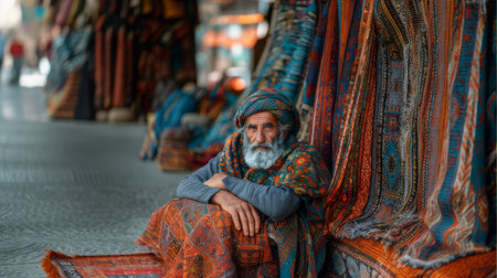 A portrait of a senior Pakistani Pathan man dressed in vibrant traditional clothes, seated contemplatively alongside a display of colorful fabrics.